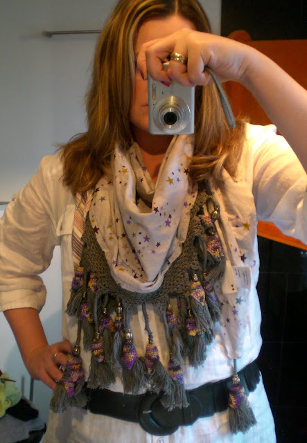 Jeg er stadig vild med det her tørklæde – selv om kvasterne faktisk er lidt tunge…..Undskyld kameraet midt i fjæset, men sådan blev det lige :o)