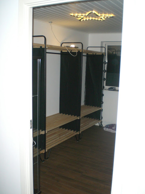SÅ – nu sker der sgu’ noget med hensyn til walkinskabværelset; har knoklet løs det meste af i går og i dag med at samle møbler, lave lys og få tingene placeret rigtigt i værelset. Jeg regner med at kunne begynde at fylde mine ting ind i værelset i morgen – det bliver så fantastisk.