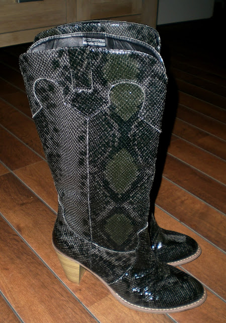 For i dag fik jeg købt noget der minder lidt om et par cowboystøvler…..hmm….i “slangeskind”. Fakta:
