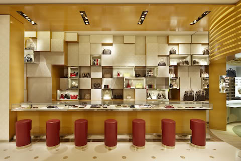 Der er investeret masser af gysser i det nye hus, som bliver et af verdens største LV-huse….udsmykningen minder på mange punkter om Champs Elysees i Paris, men flere af dekorationerne….bl.a. de 7 store vinduer ud til gaden, er lavet specielt til åbningen. “The bag bar” på det nederste billede er da helt fantastisk….gad vide om taskerne serveres med små paraplyer 🙂