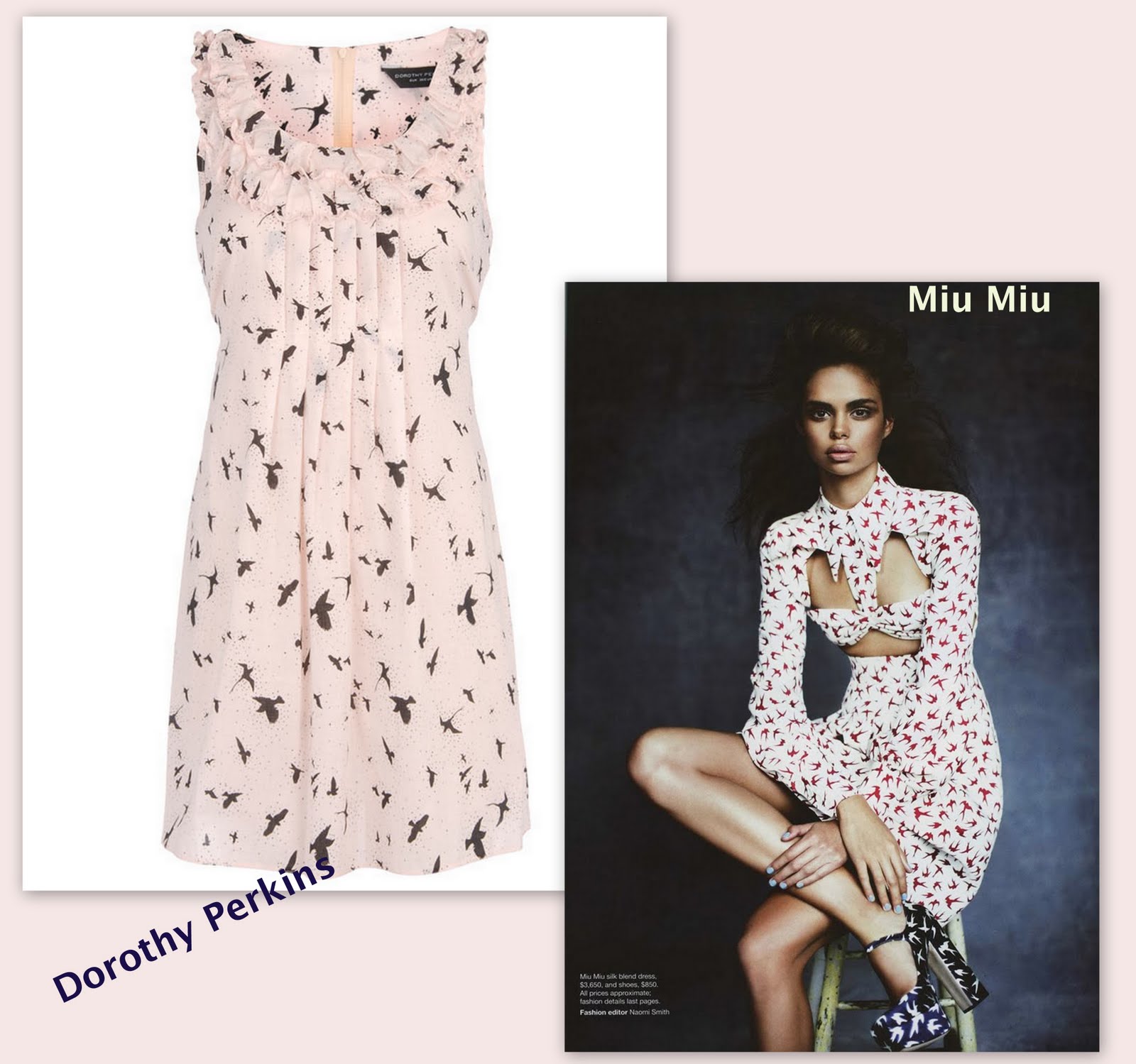 Selvfølgelig har Miu Miu ikke patent på at bruge at lave et smukt print med svaler (omend det er påfaldende at alle de andre fik ideen efter MiuMiu..hø hø) og jeg skal da være den første til at indrømme at jeg hellere smider et par hundrede efter en kjole, som er så trendbaseret, end et par-syv-femten tusind, som nu den”originale” måtte koste.